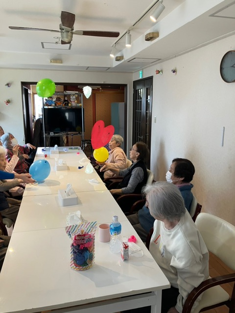 そして、皆様でテーブルで囲って「風船バレー」を行いました。「風船バレー」は上半身や腕の運動にもなります。集中力も必要で皆様の掛け合いもあり、大いに盛り上がりました。