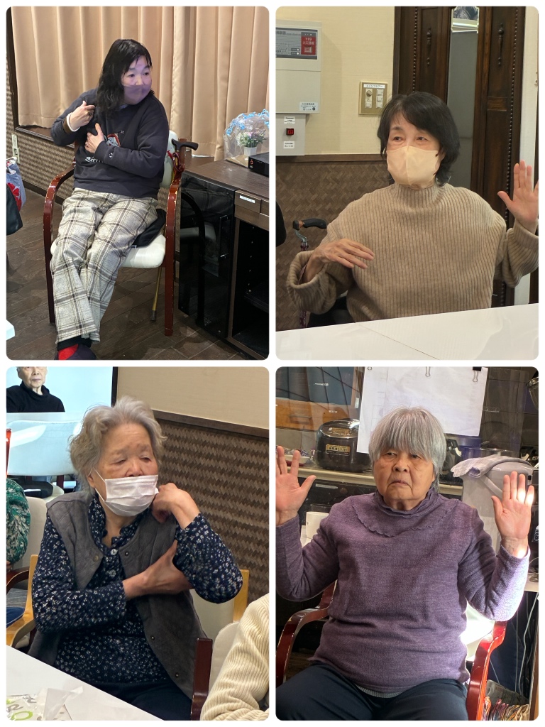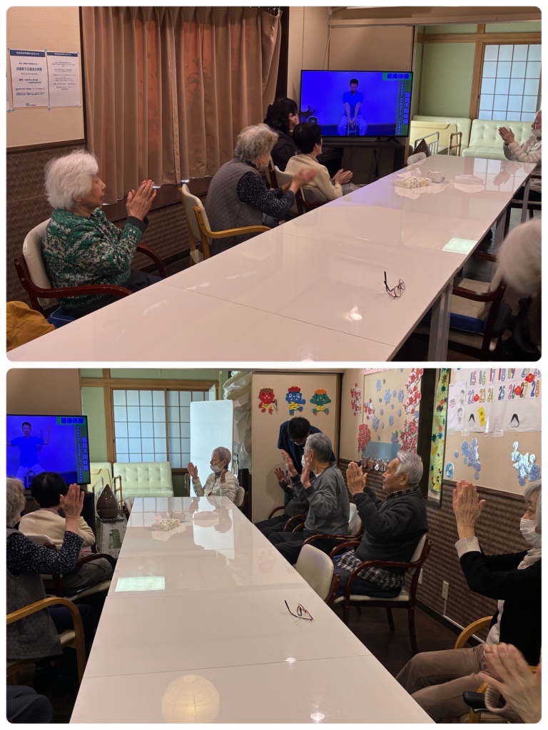 普段は、テレビを使って全身体操を流したり音楽に合わせて行うリズム体操や食事前に実施する口腔ケア体操など様々なプログラムをやっています。