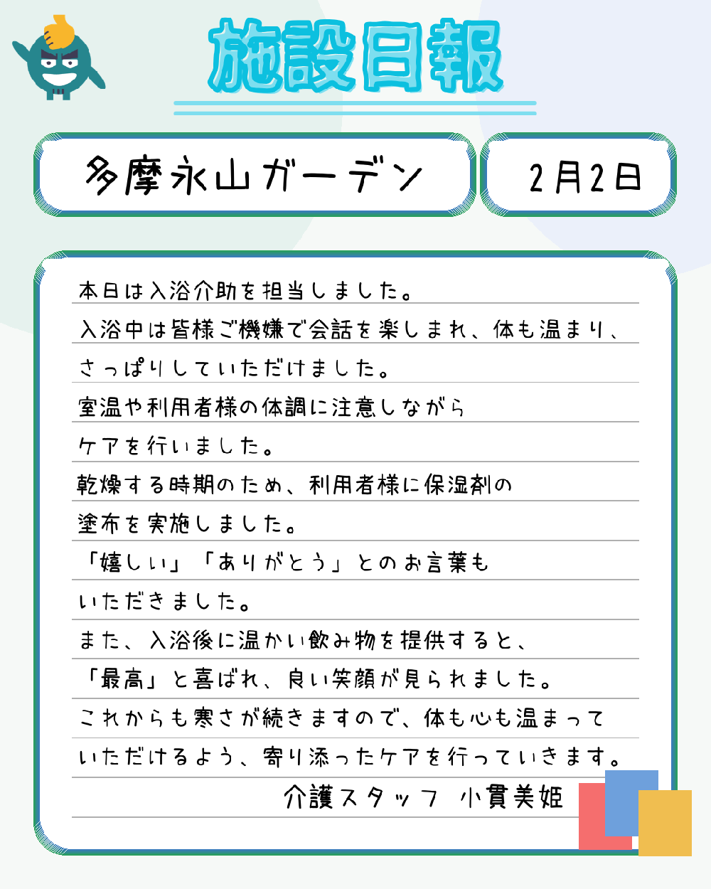 入浴中は皆様ご機嫌で会話を楽しまれ、体も温まり、さっぱりしていただけました。室温や利用者様の体調に注意しながらケアを行いました。乾燥する時期のため、利用者様に保湿剤の塗布を実施しました。「嬉しい」「ありがとう」とのお言葉もいただきました。