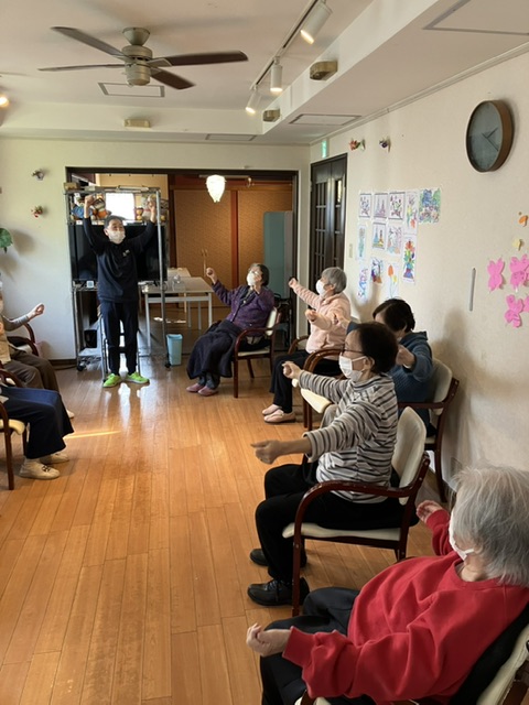 次は「機能訓練指導員(巡回看護師)」による機能訓練です。少人数対象の機能訓練です。いつもの体操とは違った動きを行なっております。