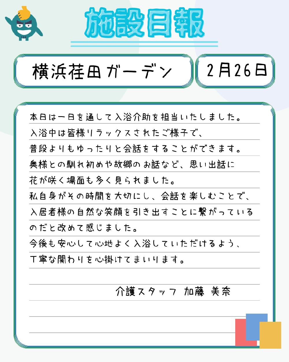 本日は横浜荏田ガーデンの介護士による施設日報です!