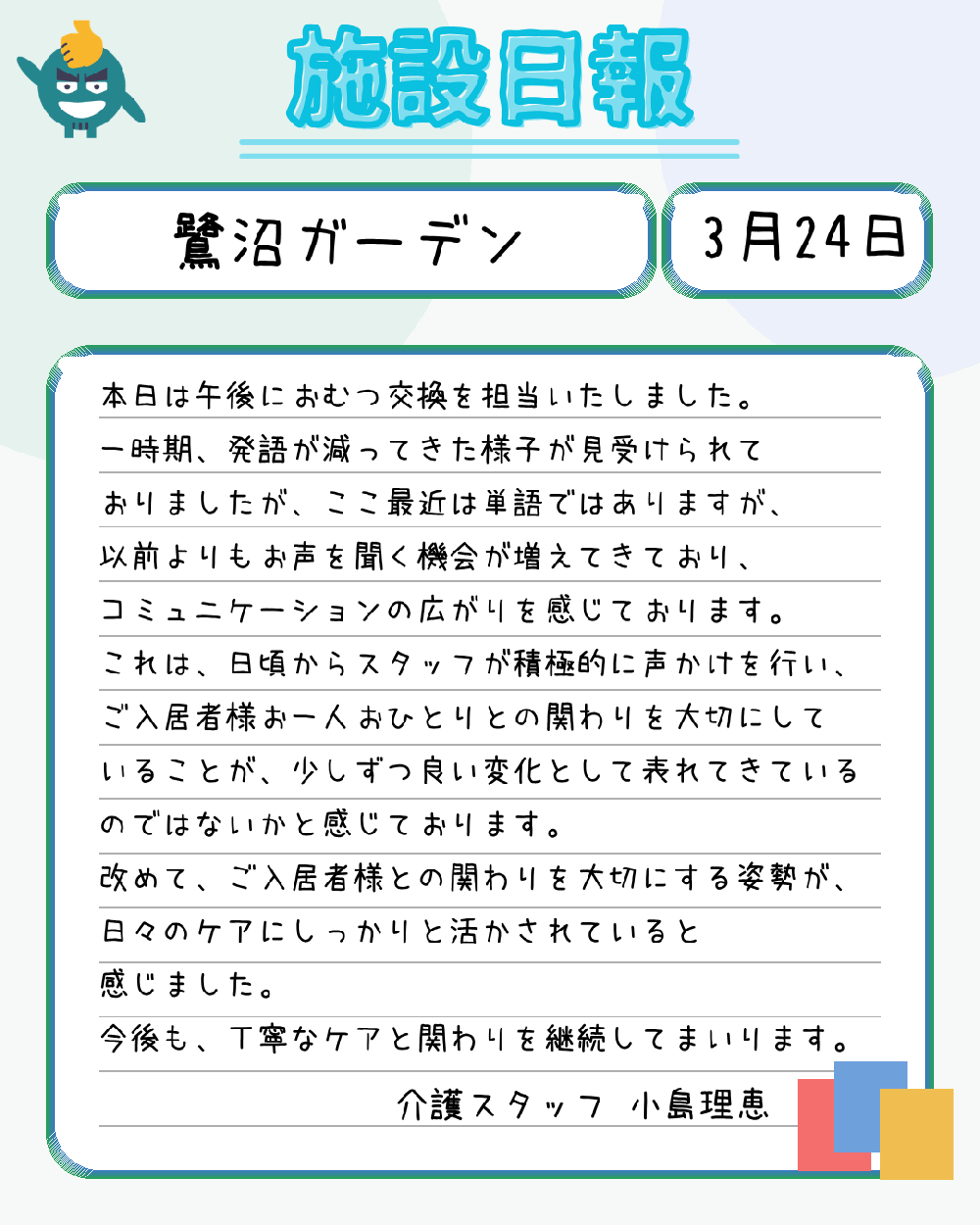 『本日は午後におむつ交換を担当いたしました。