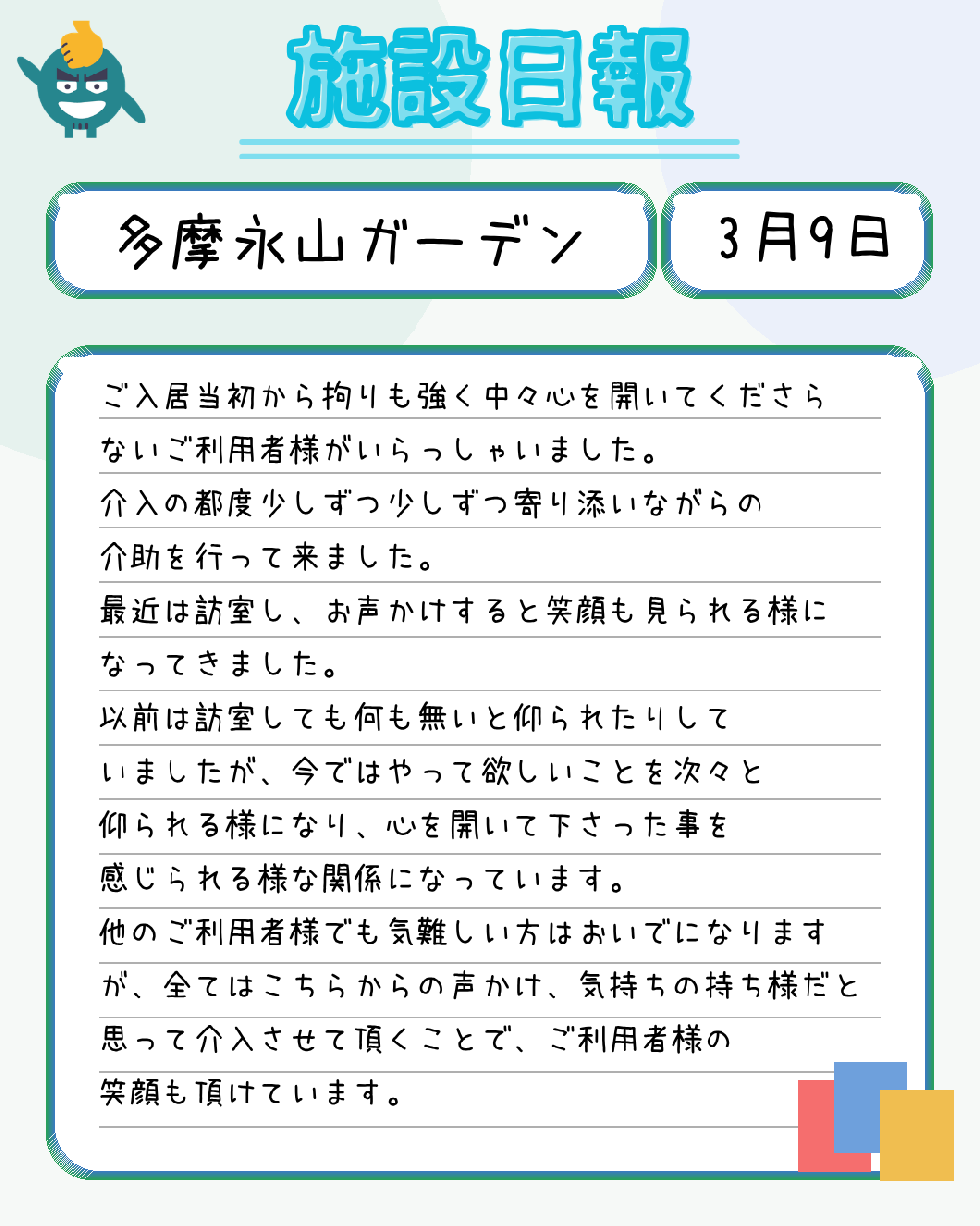 本日は多摩永山ガーデンの介護士による施設日報です!
