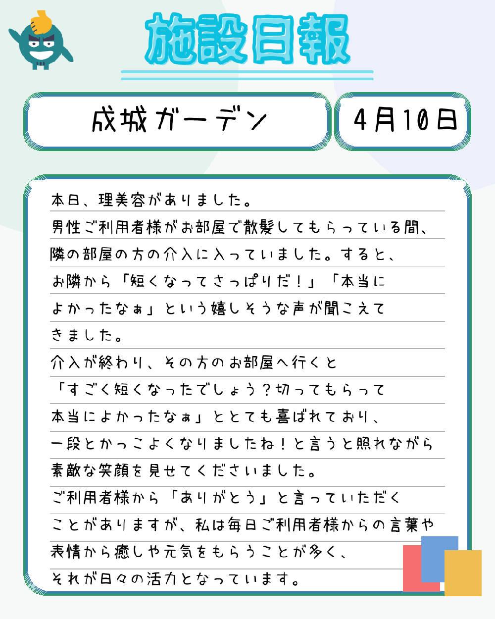 本日は成城ガーデンの介護士による施設日報です!
