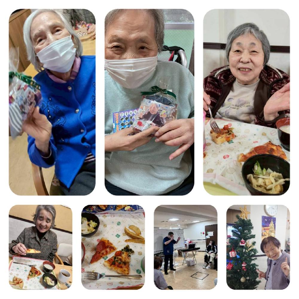 12月25日にはクリスマス会を行ない、ピザとサラダ、スープのランチにフォンダンショコラのケーキでおなかを満たした後、ビンゴ大会にご参加いただきました。「なかなか開かない」「24番来て!」「リーチは3つもあるのに!」と、大盛り上がり。見事ビンゴの方にはサンタさんからお菓子のプレゼントです。