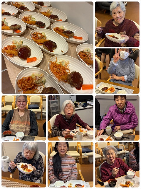 お昼は大好評の食レク!本日はハンバーグ定食!ボリューム満点誰もが大好き手作りジューシーハンバーグ+懐かしの味ナポリタン+定番安定ポテサラ+身体に優しいわかめスープ。豪華満腹コースでみなさま笑顔で大喜び♪食レクはとっても人気でリクエストが多いのでシェフも嬉しく、ますます張り切ってます♪
