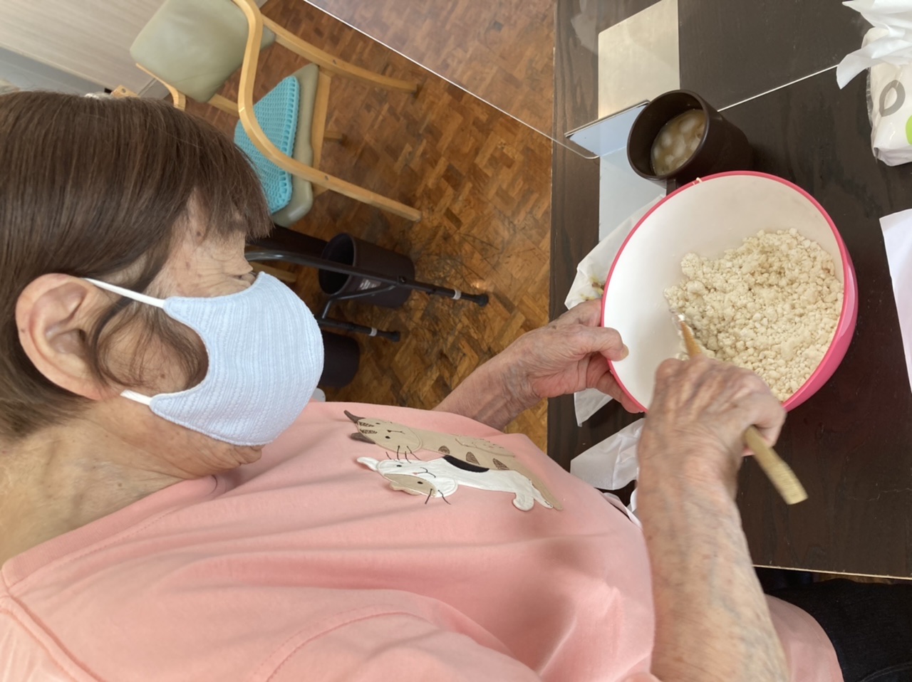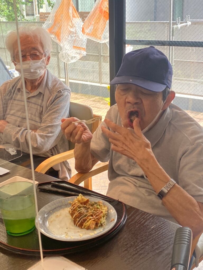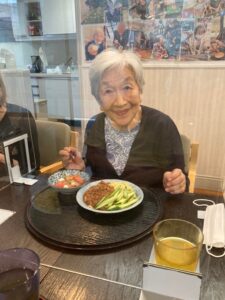 転んでしまい、入院してから退院出来たんだけど、、車椅子になり自分で動けなくなった。。→リハビリはしているけど栄養保持飲料ばかりで効果がでない。→愛燦燦で食事がとれるようになり今では職員やご家族と歩けるようになりました。