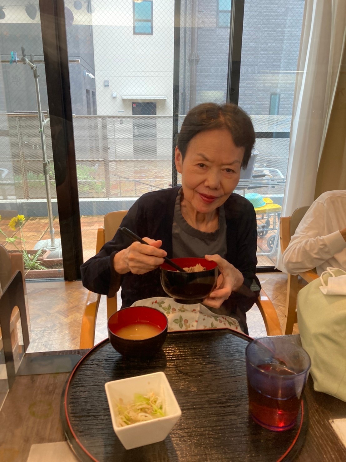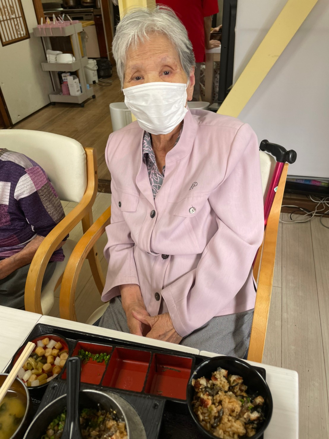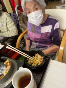 転んでしまい、入院してから退院出来たんだけど、、車椅子になり自分で動けなくなった。。→リハビリはしているけど栄養保持飲料ばかりで効果がでない。→愛燦燦で食事がとれるようになり今では職員やご家族と歩けるようになりました。