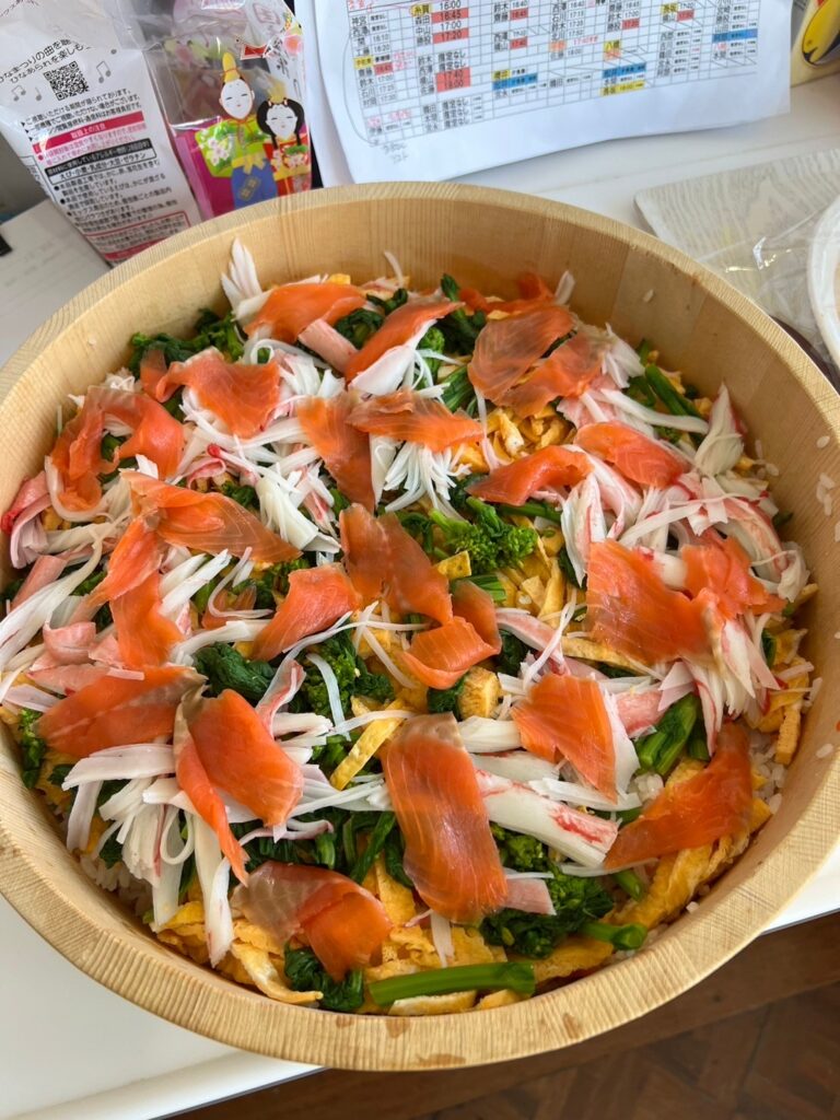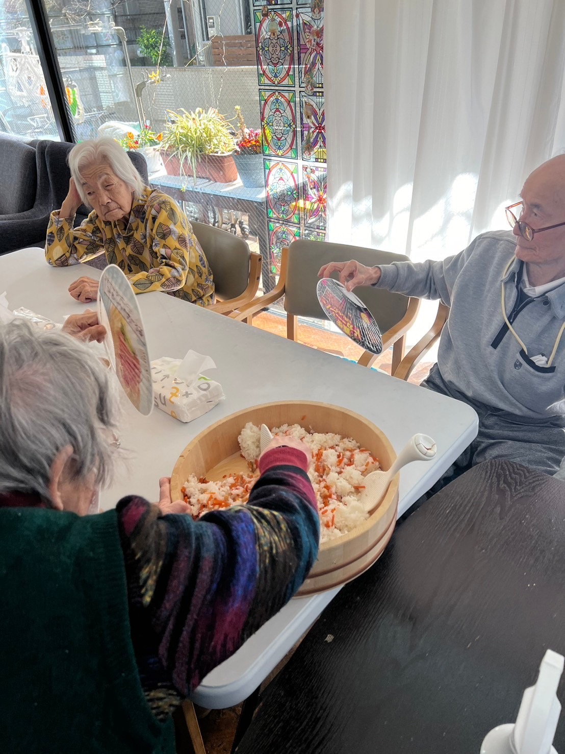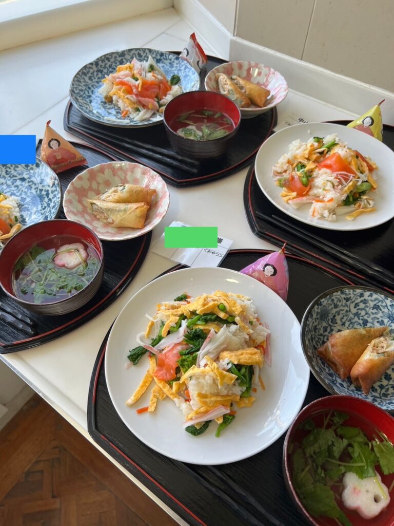 本日は母の日。感謝の意を込めて昼食にはちらし寿司、おやつは長崎のカステラをお出し致しました。