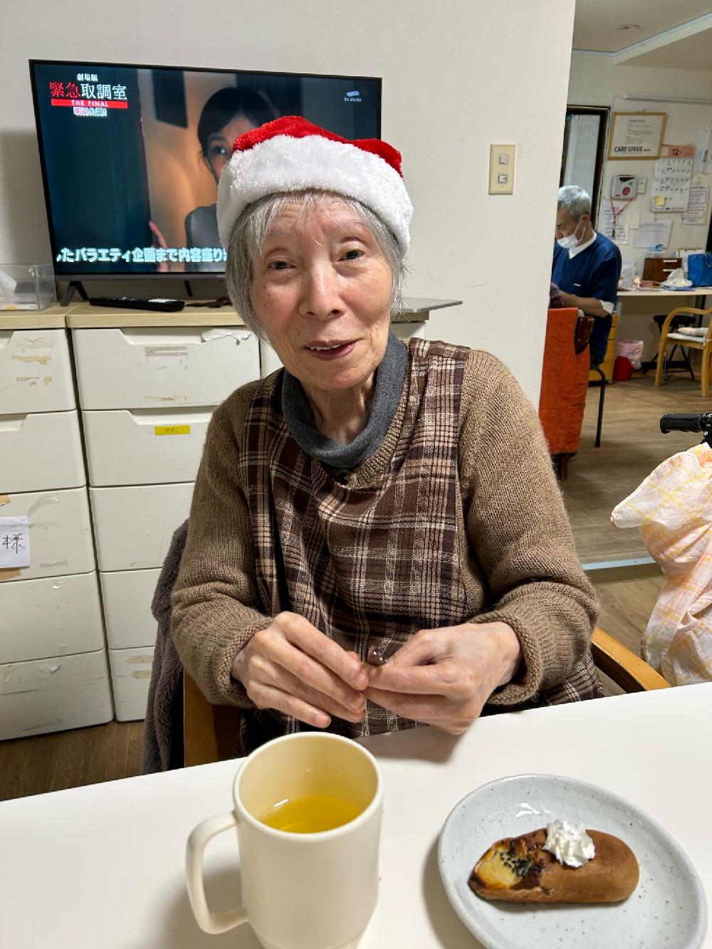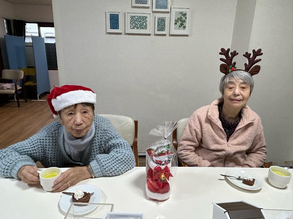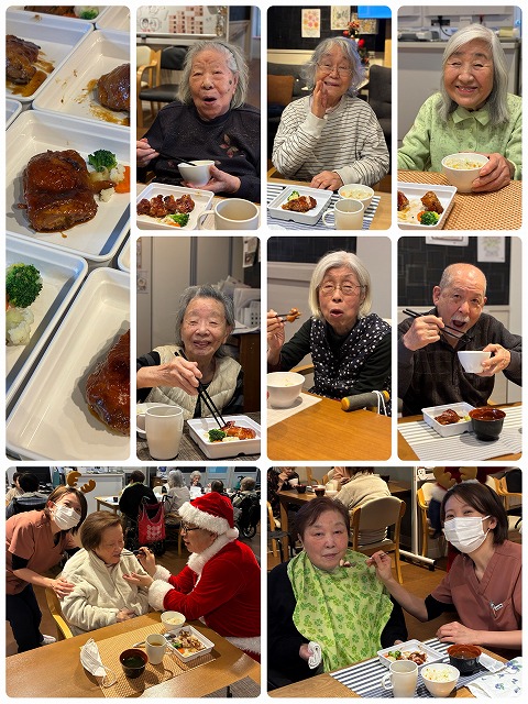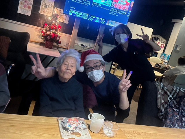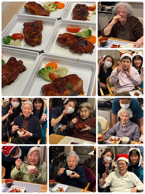 サンタの帽子を被り、豪華な食事とケーキを囲んでのパーティー!