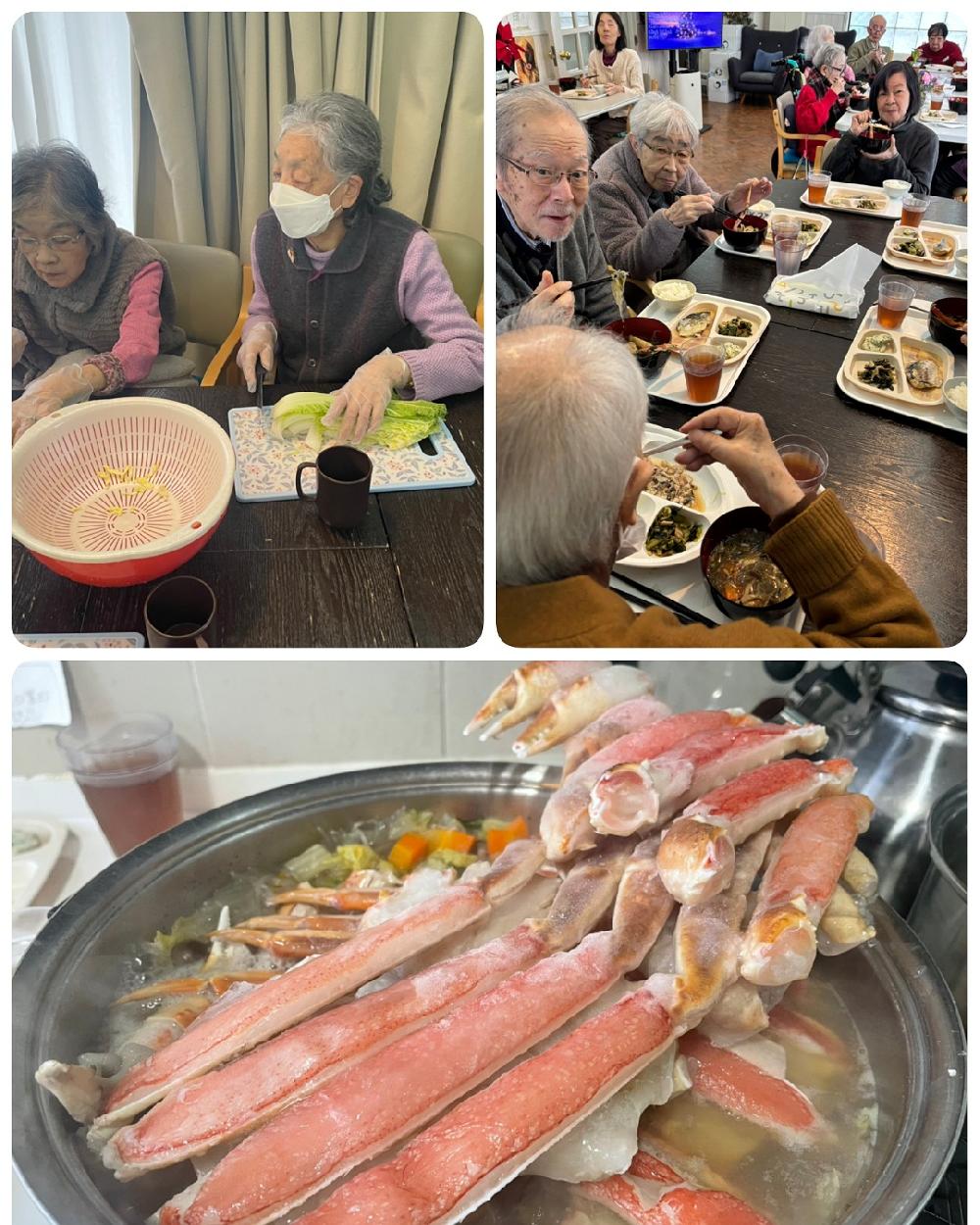 昼食に豪華カニ鍋!御利用者様も野菜を切ったり準備をお手伝いしてくださり、待ってる間は談笑で賑わっていましたがカニ鍋が到着すると…所内は沈黙に包まれました(笑)黙々と召し上がった後は「美味しかったぁ!」とまた賑やかになりました♪