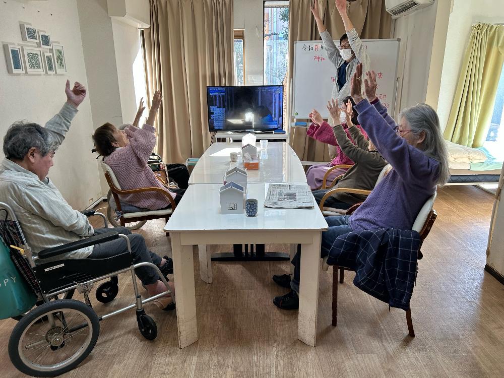ビレッジ内では、皆様元気にストレッチ、可動域を広げる運動、口腔体操、発声練習と毎日取り組ませて頂いております♪